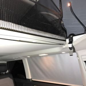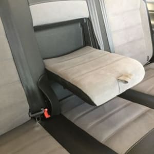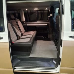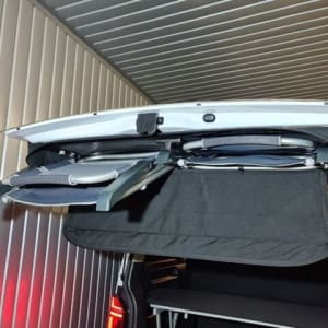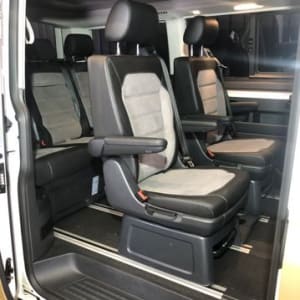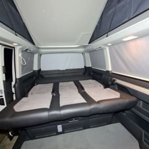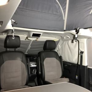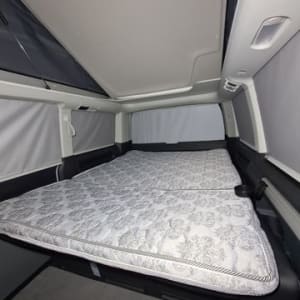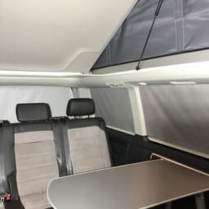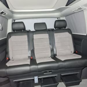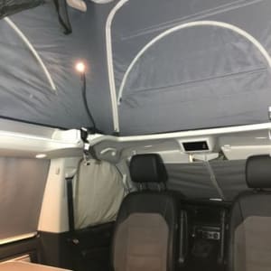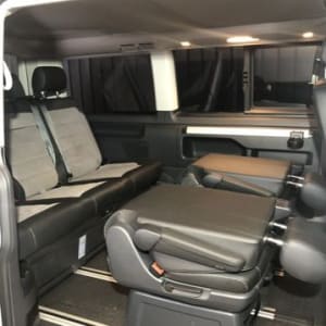 Кожаная обивка сидений со вставками Алькантара , 7 посадочных мест (сиденья все снимаются, с подлокотниками, поворотные, передние с подогревом) и трансформируются по желанию в любом направлении и 5 полноценных спальных места с матрасами, в комплекте стол и 2 стула (хранятся в боковой и задней дверях), автономный отопитель с пультом, подъёмная крыша с ручным приводом, шторки на все окна, москитная сетка съемная, лампочка-переноска на "гусиной шее", розетка 230 Вт.