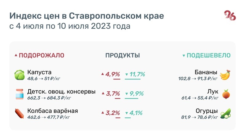 Заметно подешевели на Ставрополье бананы — на 11,7%. Их средняя стоимость составляет 91,3 руб. за кг. Также на 9,9% снизилась цена на репчатый лук — 55,4 руб. за кг. Подешевели на 4,1% свежие огурцы и на 3,4% помидоры. Средние цены на эти овощи в регионе — 78,6 руб. и 94,9 руб. соответственно. Кроме того, снизилась на 3,9% стоимость картофеля — 46,4 руб. за кг.