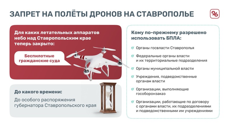 В понедельник, 27 марта, губернатор Ставропольского края Владимир Владимиров подписал постановление о запрете использования гражданских беспилотников на территории региона. Это касается всех воздушных судов, за исключением тех, что используют органы госвласти, самоуправления, а также организации, выполняющие государственный оборонный заказ.