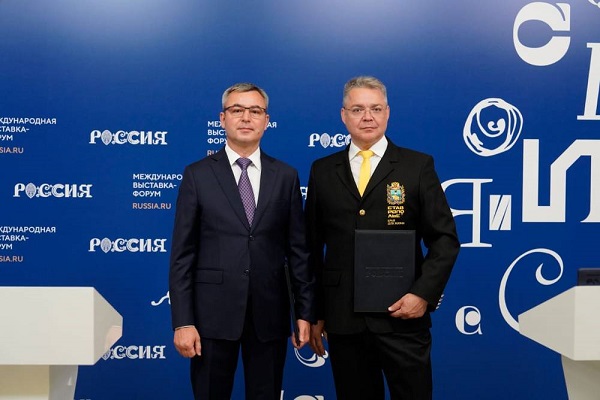 На площадке Международной выставки-форума «Россия» в Москве Губернатор Ставрополья Владимир Владимиров и генеральный директор АО «Выставка достижений народного хозяйства» Сергей Шогуров подписали соглашение о сотрудничестве между Правительством Ставрополья и ВДНХ.
