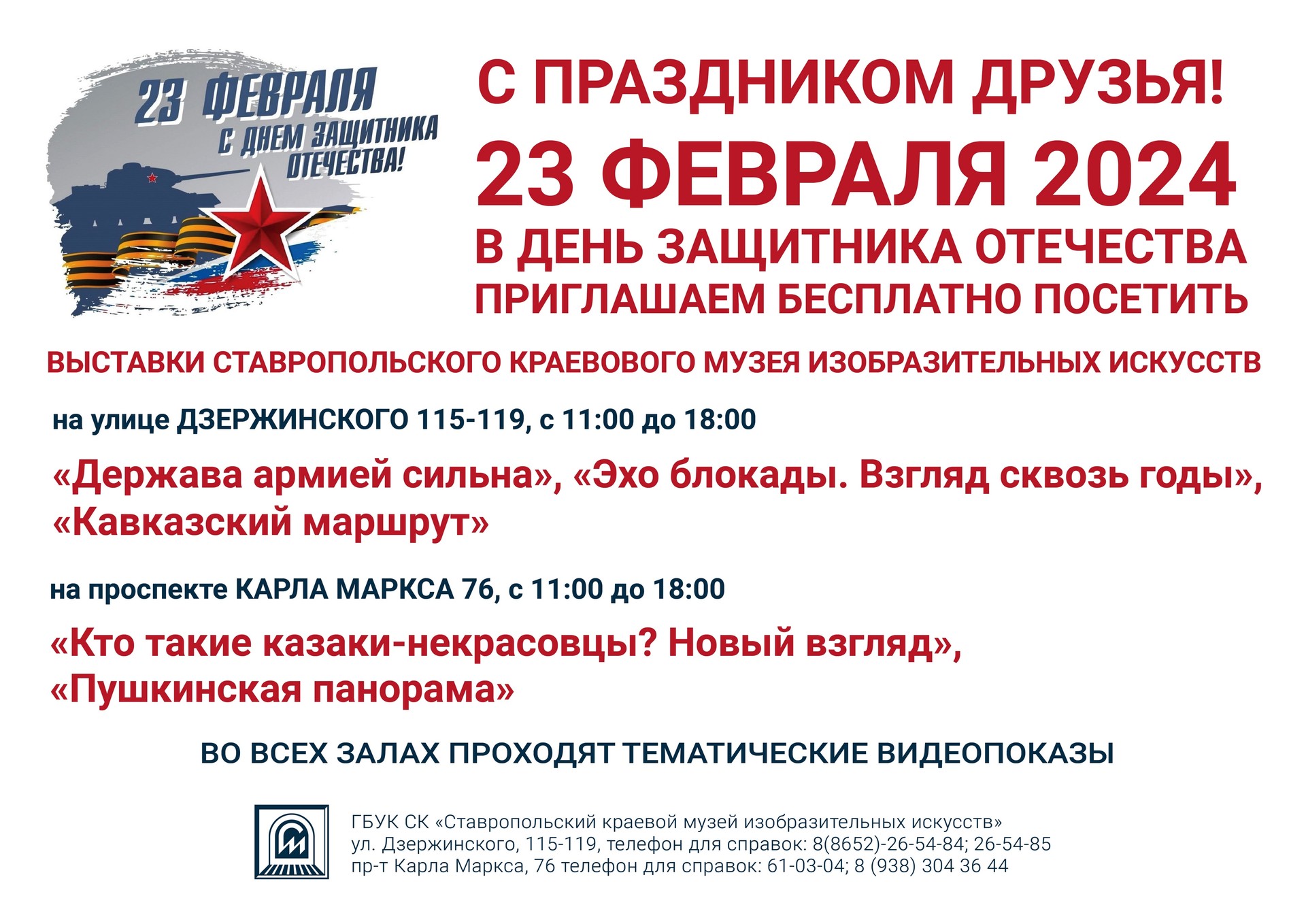 В День защитника Отечества, 23 февраля музей приглашает всех желающих бесплатно посетить выставки, работающие в залах по ул.