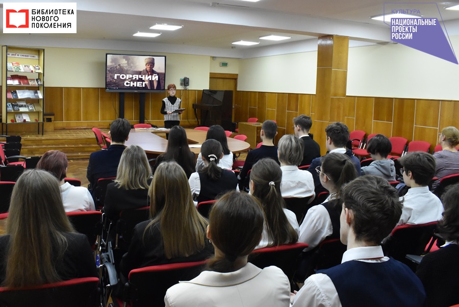 Участниками мероприятия, посвящённого этой героической дате в нашей истории и судьбоносной дате во всей мировой истории, стали старшеклассники гимназии № 11. Главный библиотекарь отдела обслуживания Августа Алякринская познакомила ребят с хроникой тех трагических дней, полных мужества и стойкости советских солдат. На книжной выставке «Этих дней не смолкнет слава», увиденной ребятами, были представлены лучшие произведения отечественной литературы, повествующие о Сталинградском сражении и героизме русского народа: «В окопах Сталинграда» Виктора Некрасова , «Жизнь и судьба» Василия Гроссмана, «Они сражались за Родину» Михаила Шолохова, «Живые и мёртвые» Константина Симонова. А в заключение был показан художественный фильм режиссёра Гавриила Егиазарова «Горячий снег», снятый по одноимённому роману Юрия Бондарева.