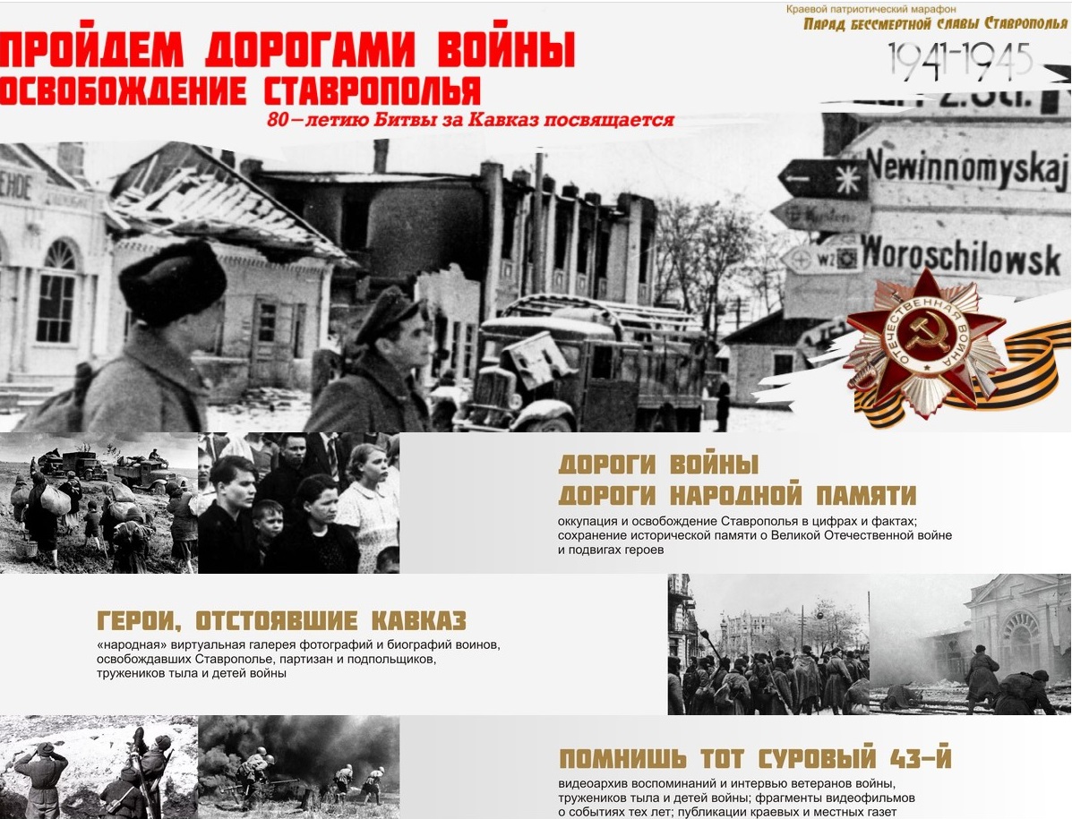 В течение 2022 года в рамках краевого патриотического марафона «Парад бессмертной славы Ставрополья» велась большая работа по подготовке контента, разработке и созданию медиаресурса. Медиаресурс аккумулирует документы, воспоминания людей – участников и очевидцев событий времен Великой Отечественной войны на Ставрополье, его освобождения. Усилиями историков, архивистов, библиотекарей, жителей края удалось собрать немало уникальных материалов, представленных в виде виртуальной галереи фотографий и биографий воинов, освобождавших Ставрополье, партизан и подпольщиков, видеоархива воспоминаний ветеранов, тружеников тыла и детей войны. Ресурс также включает перечень Книг Памяти городов и сел Ставропольского края, виртуальную выставку книг «Адрес подвига – Кавказ», интернет-викторину «Огненные рубежи Ставрополья». Он в полной мере может быть использован в школьной и вузовской работе, дальнейшей исследовательской деятельности по изучению родного края.