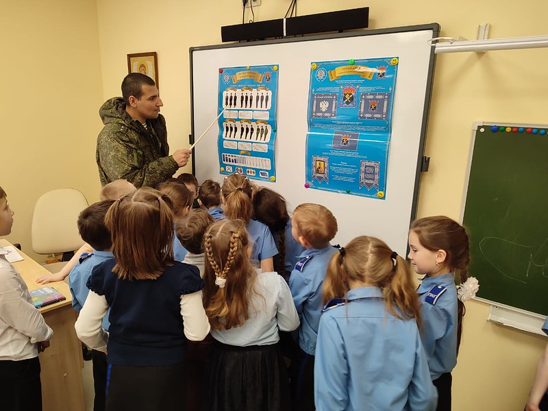 Первоклассники проявили большую активность в течение всего занятия, находили сходства со своей формой, которую они носят, обращали внимание на форму Артема Романовича, какие у него погоны и знаки отличия.