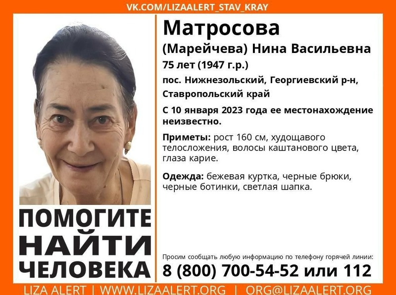 Женщину зовут Нина Васильевна. Телосложение – худощавое. Рост 160 см, волосы каштанового цвета, глаза карие. В день исчезновения на пенсионерке были чёрные брюки, чёрные ботинки, бежевая куртка и светлая шапка.
