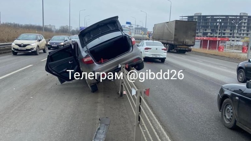 В субботу, 21 января, около 14:20 на дороге «Кавказ» водитель грузового тягача столкнулся с Kia Rio. По инерции иномарка зацепила тросовое ограждение и повисла на нём.