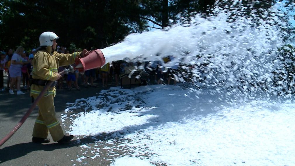 Также на встрече дети примерили костюмы пожарных и узнали об устройстве пеногенератора.