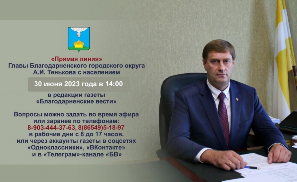 30 июня на базе районной газеты "Благодарненские вести" Глава Благодарненского городского округа Александр Иванович Теньков проведет очередную "прямую линию" с жителями округа.