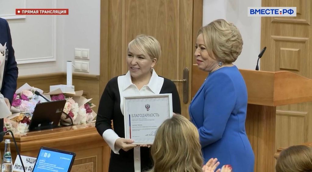 Кроме того, была вручена Благодарность Председателя Совета Федерации Валентины Матвиенко за большой вклад в развитие местного самоуправления в Российской Федерации и многолетнюю добросовестную работу Ирине Гусевой, сопредседателю ВАРМСУ, члену Совета при Президенте РФ по развитию местного самоуправления.