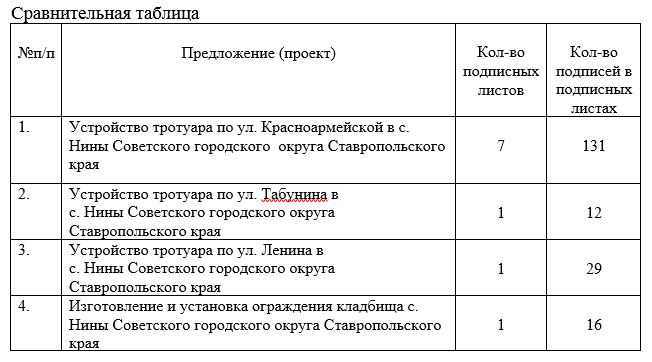 По результатам проведения опроса жителей села Нины с помощью подписных листов, с целью определения приоритетного проекта, наиболее значимым является проект: «Устройство тротуара по ул. Красноармейской в с. Нины Советского городского округа Ставропольского края».