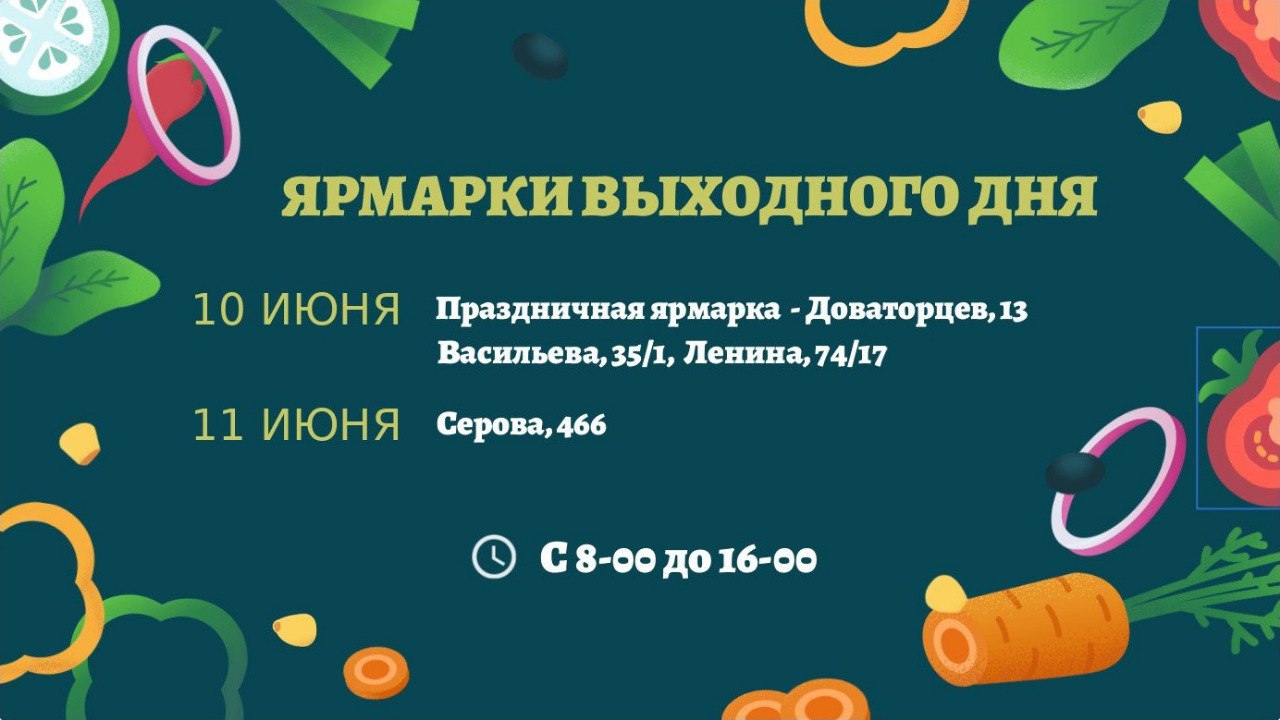 Также в субботний день ярмарки выходного дня развернутся на у л. Васильева, 35/1 и Ленина , 74/17 . А в воскресенье, 11 июня , торговля пройдет на ул. Серова, 466 . Время работы: с 08.00 до 16.00 .