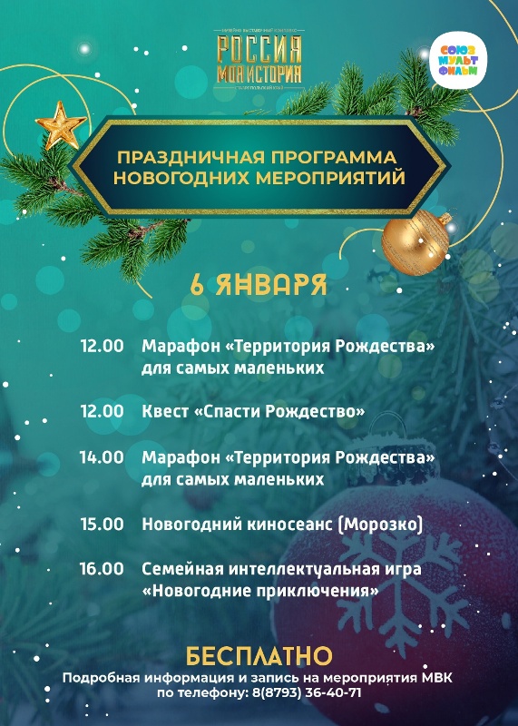 Так, 6 и 7 января запланированы марафон для самых маленьких, квест-игра «Спасти Рождество», показ киносказки «Морозко» и семейная интеллектуальная игра «Новогодние приключения». Подробности – в афишах.