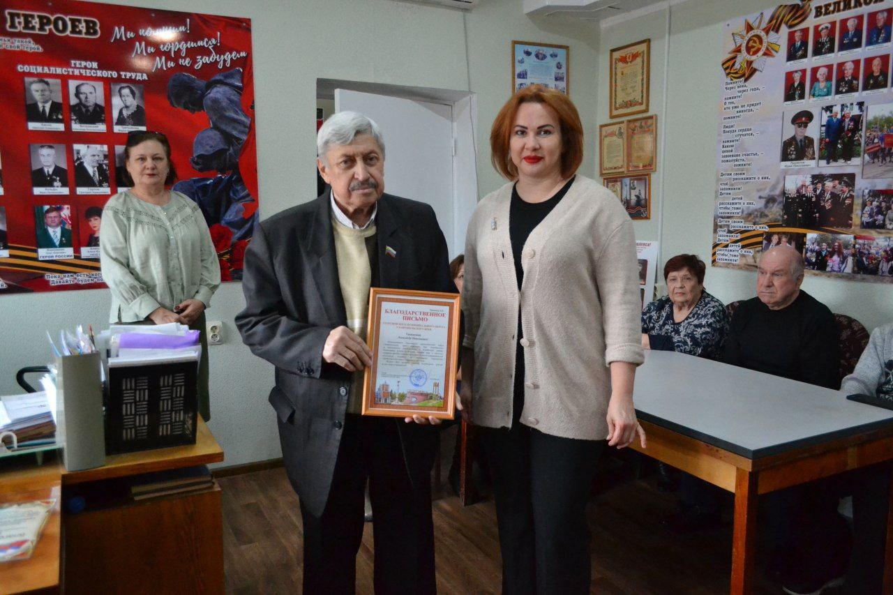 Управляющий делами администрации Людмила Сергеевна Мочалова вручила Александру Николаевичу Гришину, который на протяжении 3-х лет являлся председателем местного Совета ветеранов, Благодарственные письма от администрации Георгиевского муниципального округа и Ставропольского краевого Совета ветеранов за многолетнюю добросовестную работу, достигнутые успехи в области защиты прав и законных интересов граждан старшего поколения и большой вклад в военно-патриотическое воспитание молодежи.