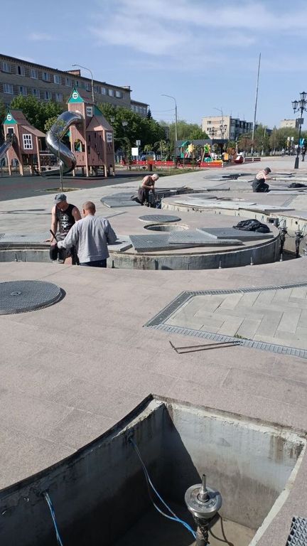 Работники МБУ по благоустройству открывают, промывают, очищают от грязи сооружения, проверяют механизмы фонтанов, проводку и освещение в них.