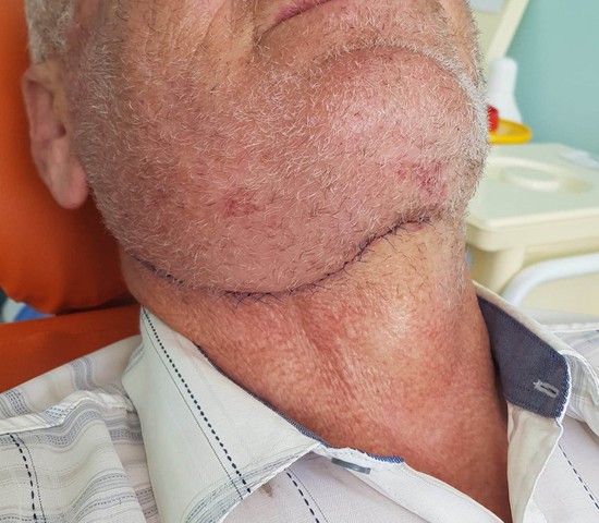 Перед операцией человеку сделали индивидуальный эндопротез ветви нижней челюсти справа, шаблон для резекции. Подготовка позволила сильно сократить время пребывания пациента под наркозом и улучшила эстетический и функциональный результат лечения. Рубец через несколько месяцев становится почти незаметным, повторяет шейные складки.