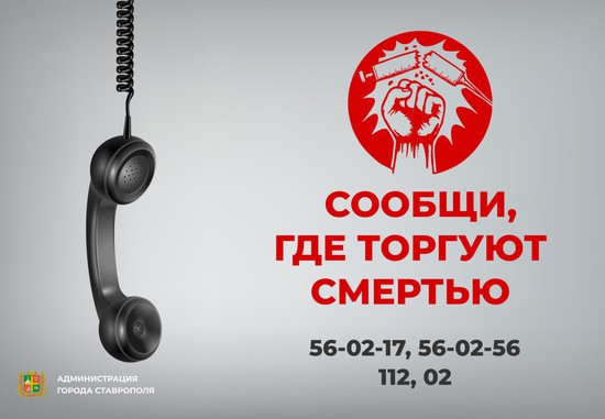 В борьбу с пагубной привычкой, незаконным оборотом наркотиков вклад может внести любой житель или гость Ставрополя. Для участия во всероссийской сообщите о точках продажи запрещенных средств, наркопритонах и местонахождении наркоторговцев по телефонам 02, 102 с мобильного или в любом отделе МВД.